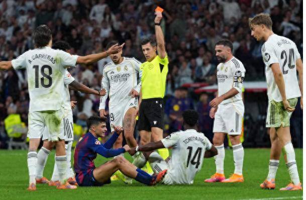 然而,比赛尾声的冲突却让整个赛场气氛彻底升温。第90分钟,佩德里因为一次失误铲倒了琼阿梅尼,累计两张黄牌被罚下场,这一动作成为了冲突的导火索。比赛结束后,双方球员在替补席附近发生了激烈对峙,维尼修斯与巴萨球员费兰·托雷斯、巴尔德等人发生了口角,随后越来越多的球员和工作人员加入了混战,场面一度失控,最终不得不由警察介入才得以平息。